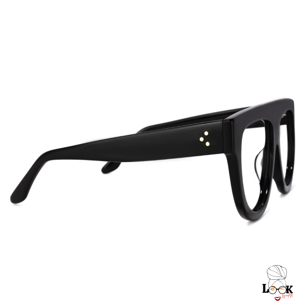 The full-rim frame has a big and bold personality. Made of high-quality plastic, the glasses feature wide rim and temple arms, and it's about 25g. The small gold clots on the temple arms make it more exquisite. It is a better choice for party.
