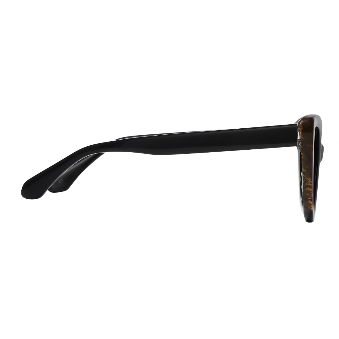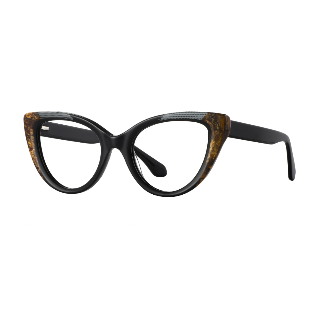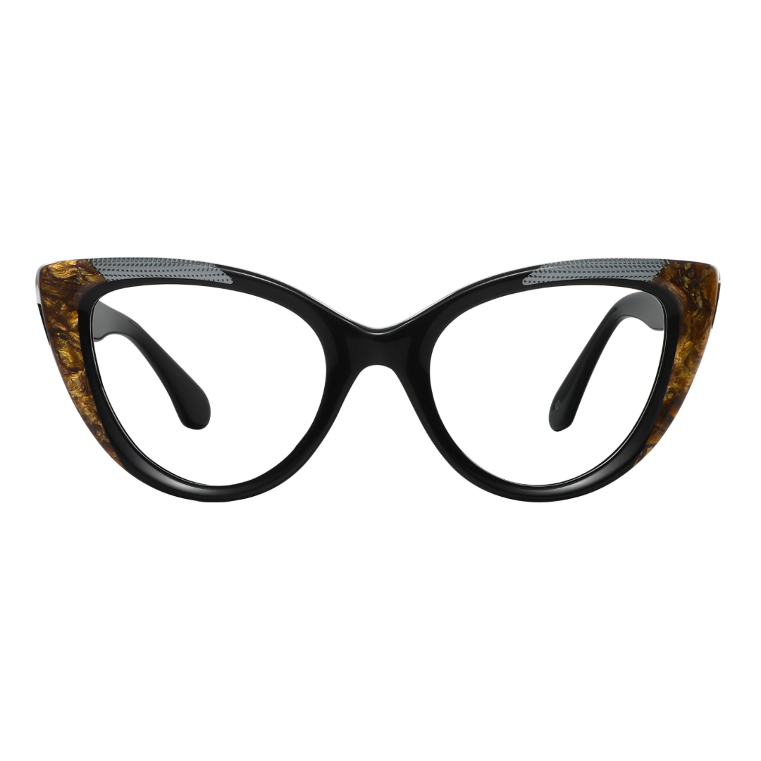 This elegant pair of cat-eye glasses combines retro charm with modern style. Featuring a bold black frame accentuated with tortoiseshell details at the corners, these glasses are perfect for anyone looking to make a fashion statement while maintaining a sophisticated edge.